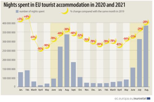 EUの観光施設宿泊数を見ると、8月にはコロナ前の▲2割程度まで戻せていたようです。しかし、去年同様冬場に向けてコロナ感染が急拡大しているので、また▲8割くらいまで再び凹んでしまうかもしれません。 6-8月の3ヶ月で見ると、EUはコロナ前(2019年)比▲3割…