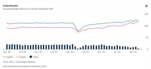 今朝ドイツ連邦統計局から、3月の貿易統計が発表され、 輸出(青線)減+輸入(赤線)増⇒貿易黒字(黒棒)急減 という結果になっていました。Exporte im März 2022: -3,3 % zum Februar 2022 - Statistisches Bundesamt (destatis.de) ①輸出全体 3月単月:前…