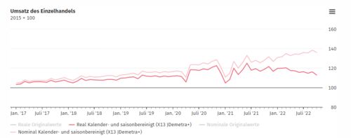 先ほど10月のドイツ小売売上高について以下の通り発表がありました。 実質:前月比▲2.8% 前年同月比▲5.0% 名目:前月比▲1.7% 前年同月比+6.2% 名目(薄赤)と実質(赤)のインデックス(水準)を対比すると、きれいな「ワニの口」を形成しています。 も…