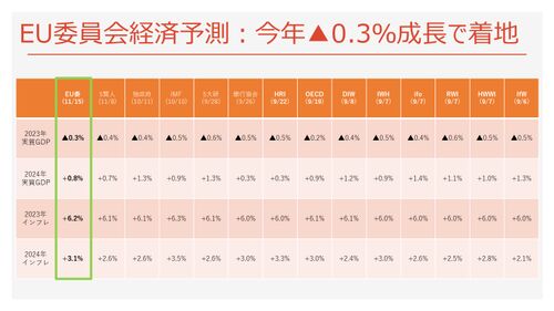 昨日EU委員会から秋の経済予測が発表されていますので、そのドイツ部分のエッセンスをご紹介します。 GDPは、今年▲0.3%(前回9月比+0.1%上方修正)、来年+0.8%(▲0.3%下方修正)、再来年+1.2%。 インフレと高金利により消費が低迷。但し、来年以降はイ…