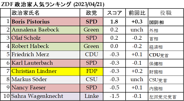 ドイツ公共第2放送(ZDF)の直近世論調査(Politbarometer)によると、ドイツの政治家の人気ランキングは上図の通りとなっており、ピストリウス国防相のトップ独走状態となっています。