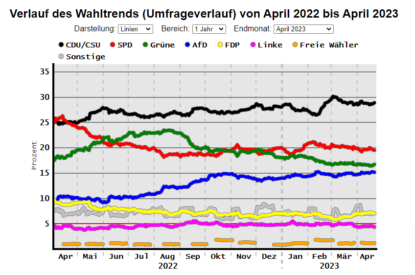 主要世論調査機関の政党別支持率平均値の推移を見ると、極右(AfD:青線)がじわりと支持率を上げて、Green(緑線)に肉薄していることが判ります。