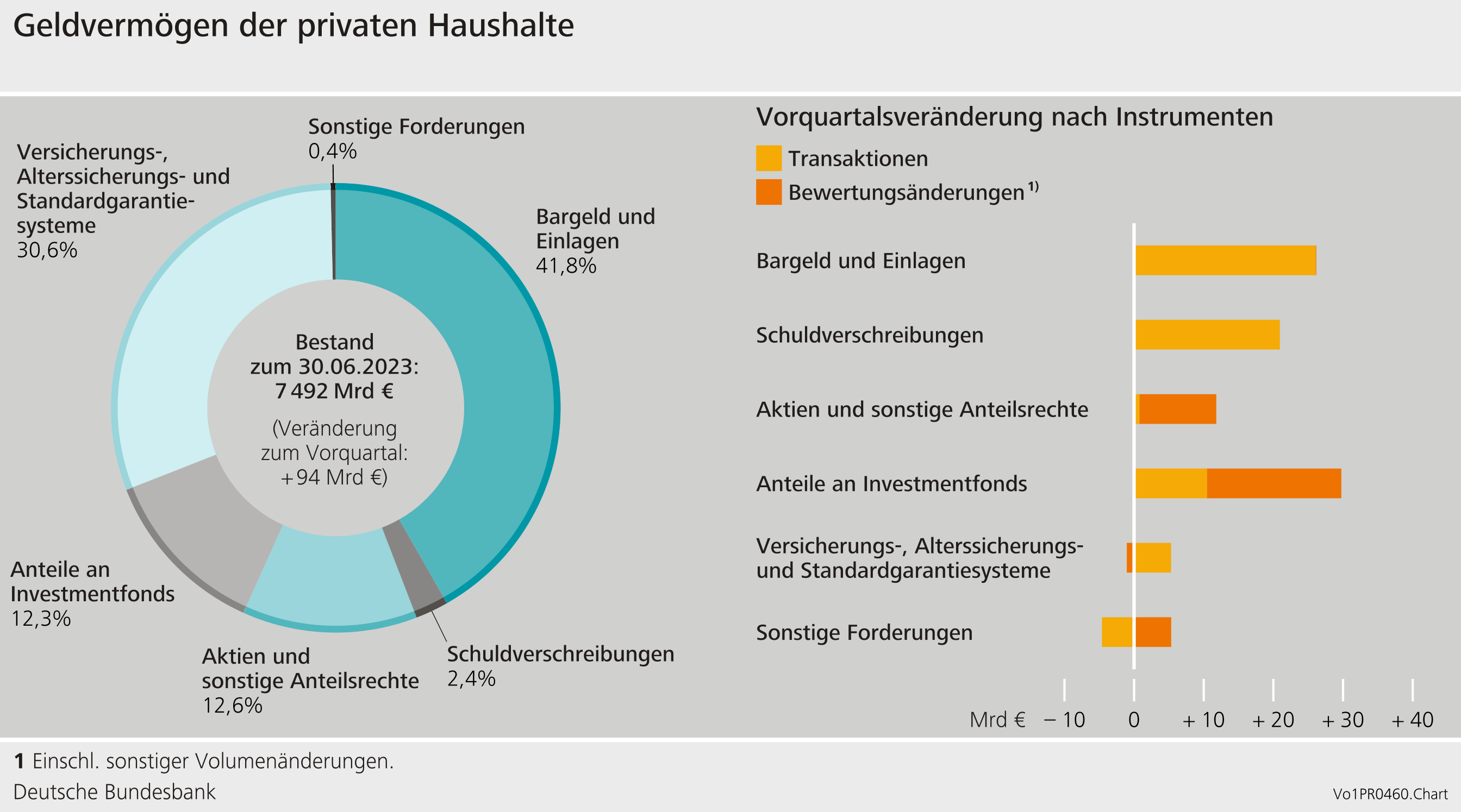 先ほどドイツ連銀が発表したデータ(2023年6月末時点)によると、ドイツの個人(家計)の金融資産は上図の通り、金利や評価額上昇のおかげで3月末比940億EUR増加し、7.49兆EURとなっていました。