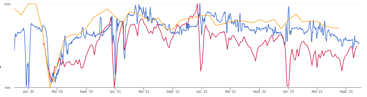 ●鉱工業生産(黄)の先行指標である、トラック物流(青)と航空貨物(赤)も冴えない動きが続いており。。。