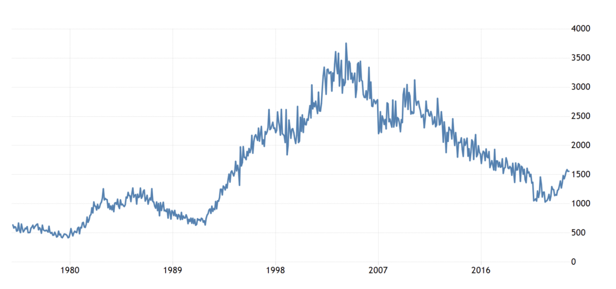 ①企業倒産件数(10月)〜コロナ対策で低水準の去年と比べると+19%(青)となっているが、2ヶ月先の先行指標(赤)は横ばいで落ち着いている。長期的に見ても(下のグラフ)かなりの低水準にとどまっており、失業や銀行貸出へのダメージは限定的。