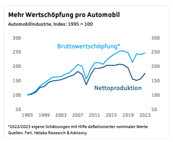 ③自動車生産と付加価値の関係~近年、自動車一台当たりの付加価値(薄青)はドイツ国内での生産量(紺)を大きく上回っている。国内での生産は付加価値の高い重要なものに絞り込み、海外(特に中国)からその他の部品を安く調達して、最終製品を高く売ることができている状態を示唆している。車だけでなく他の製造業でも同様の現象が発生しているので、実質GDPは鉱工業生産の見かけほど弱くない。