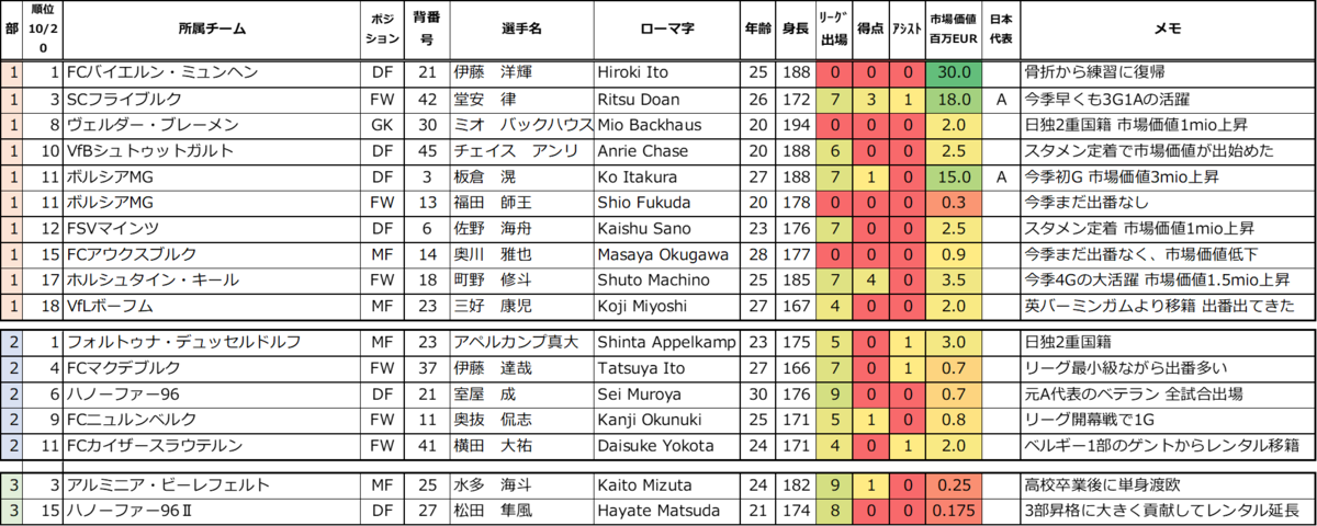 2024-10-21 20241020 ブンデスリーガ日本人選手一覧 スポーツ ドイツ ブンデスリーガ 日本人選手 日本 海外生活 堂安律 板倉滉 伊藤洋輝 板倉滉今季初ゴールで対ハイデンハイン戦での勝利に貢献。 堂安律は今季初アシスト(ゴールは既に3)でチームのリーグ3位浮上に貢献。 デュッセルドルフはレーゲンスブルクに3-0で快勝、2部トップをキープ。 今週は多くの選手の市場価値変動アリ。 https://www.bundesliga.com/jp/bundesliga/player <関連日本語ニュース> www.nikkansports.com www.nikkansports.com sportsbull.jp hochi.news www.soccer-king.jp news.nifty.com <関連動画> www.youtube.com <当チャンネル関連> www.youtube.com www.newsdigest.de