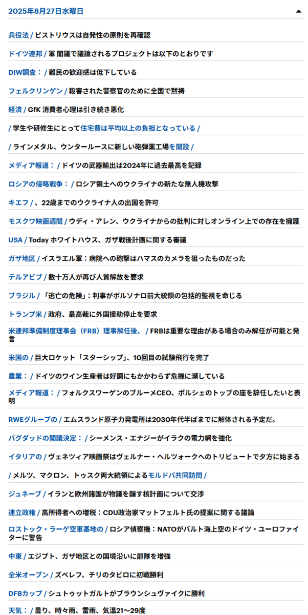 - トランプ大統領によるFRB(中央銀行)攻撃(クック理事解任)とフランス政局不安(9/8不信任やゼネストの可能性大)はドイツでも大きく報じられている。