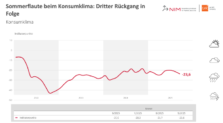 - GfK消費者信頼感指数(9月)~ドイツ消費者信頼感が横ばいから悪化へ転じつつある。特に所得期待と購買意欲が悪化。失業への不安とインフレ懸念が消費者心理を圧迫。地政学リスク、トランプ関税、メルツ政権の不人気なども逆風。