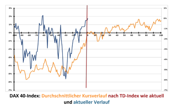 【DAX40 の季節性】~DAXのアノマリーとしては、年末に向けて上昇しやすく、今回も実際にそうなったが、今後は当面横ばいになりやすい(黄色線)。